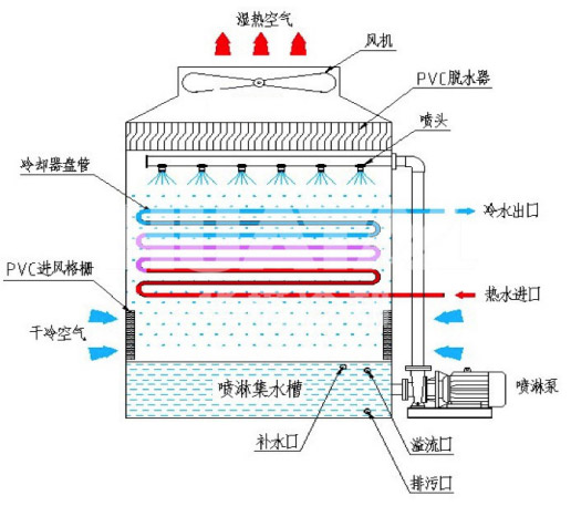 The working fluid (pure water or other liquid) circulates in the coil of the closed cooling tower. The heat of the working fluid is dissipated into the water flowing through the coil through the coil. At the same time, the air outside the unit enters from the air inlet grille on the side of the bottom of the coil, which is opposite to the flow direction of the water and flows through the coil in reverse direction. A small part of the water evaporates and absorbs the heat, The hot and wet air is discharged into the atmosphere by the exhaust fan at the top of the cooling tower; The rest of the water falls into the bottom tank, which is recycled by the pump to the water distribution system and back to the coil.
